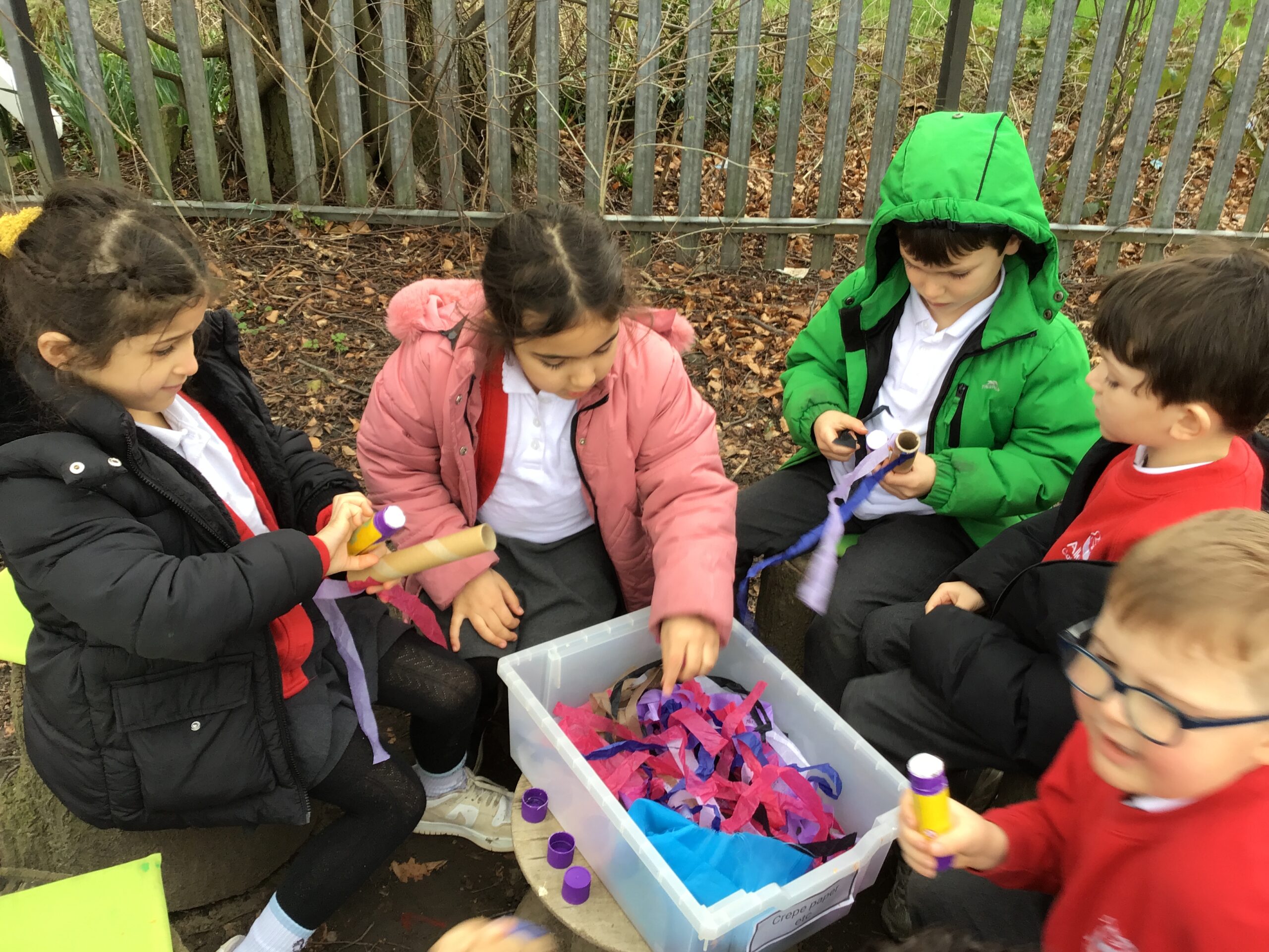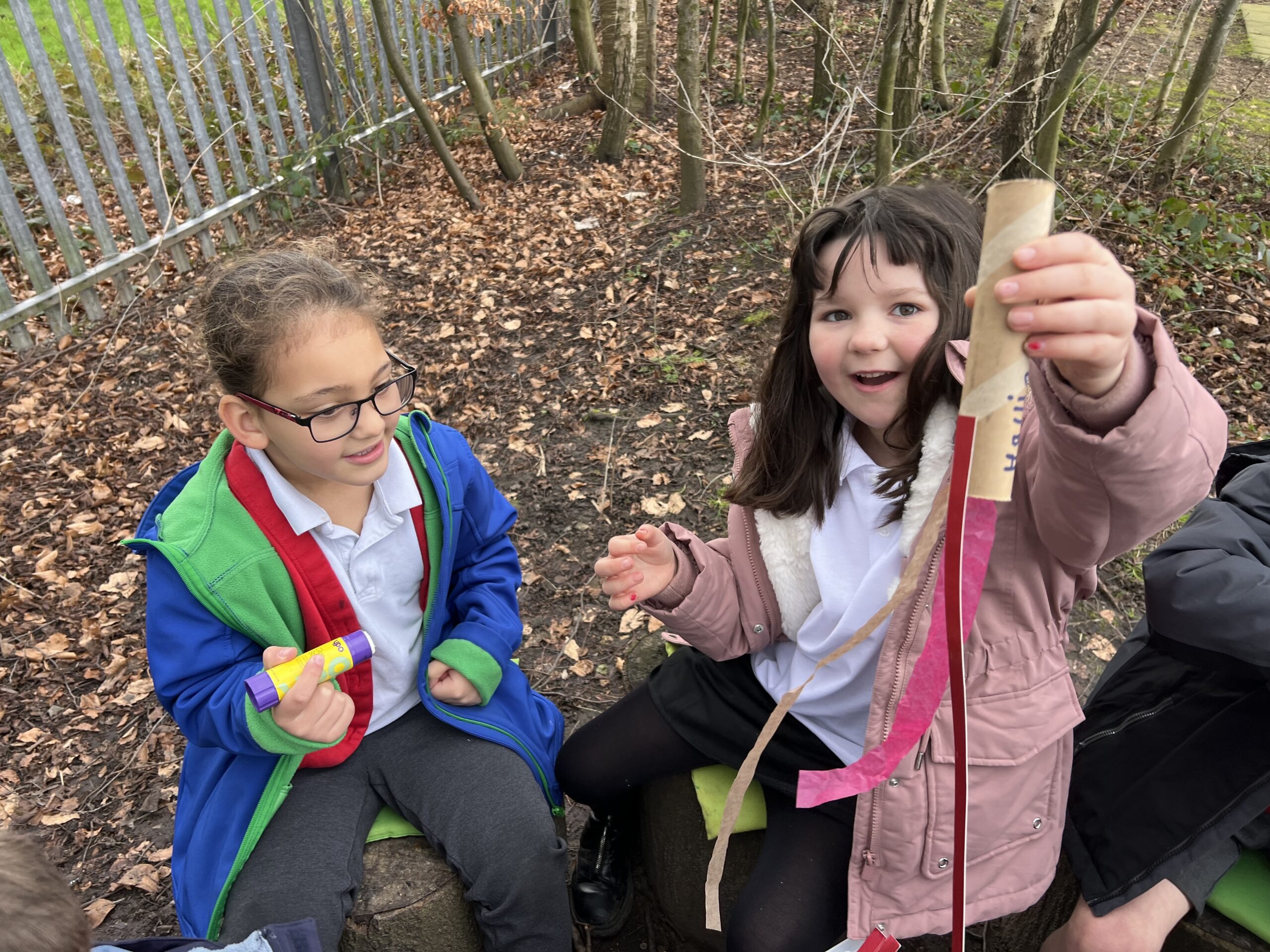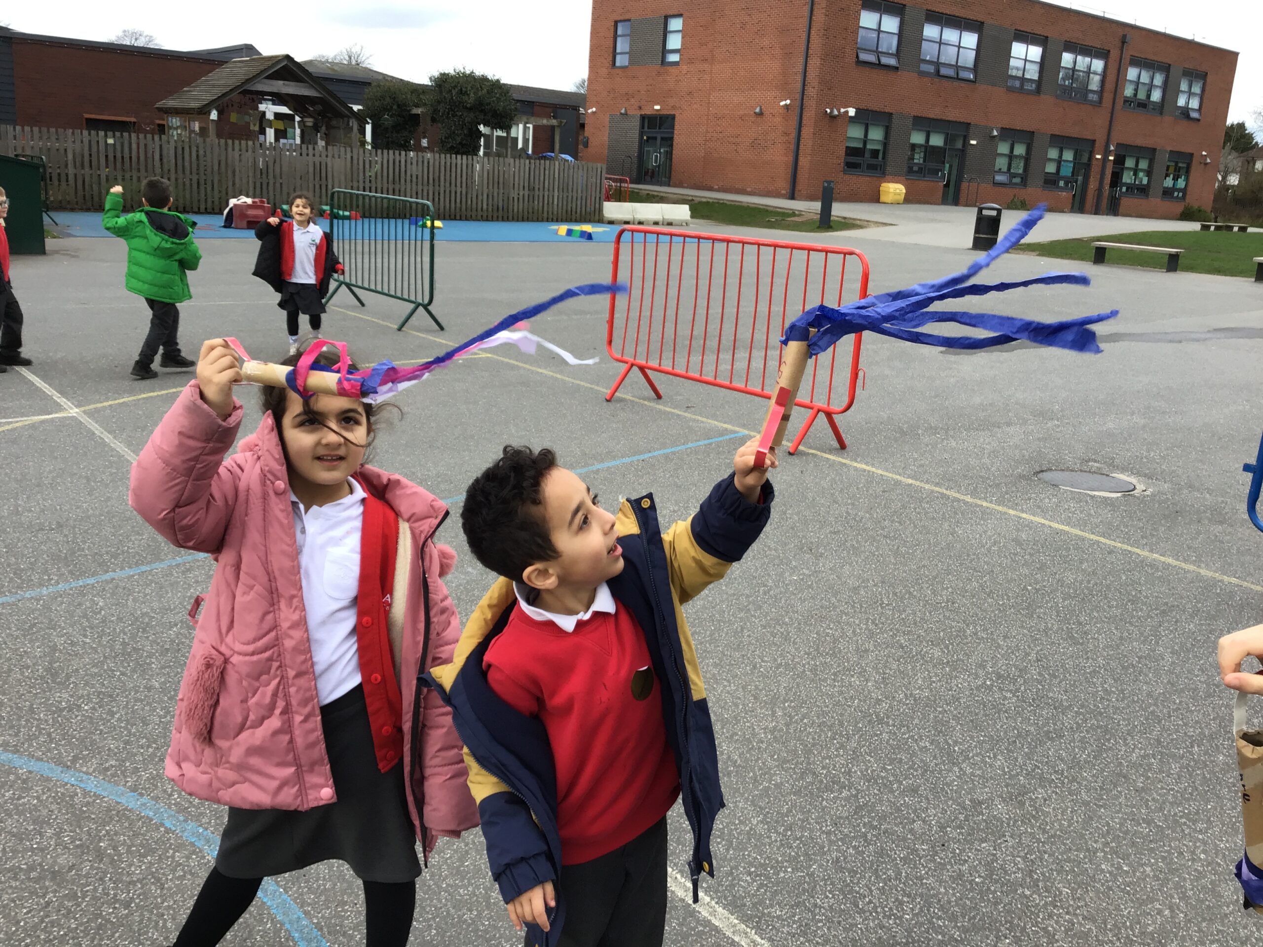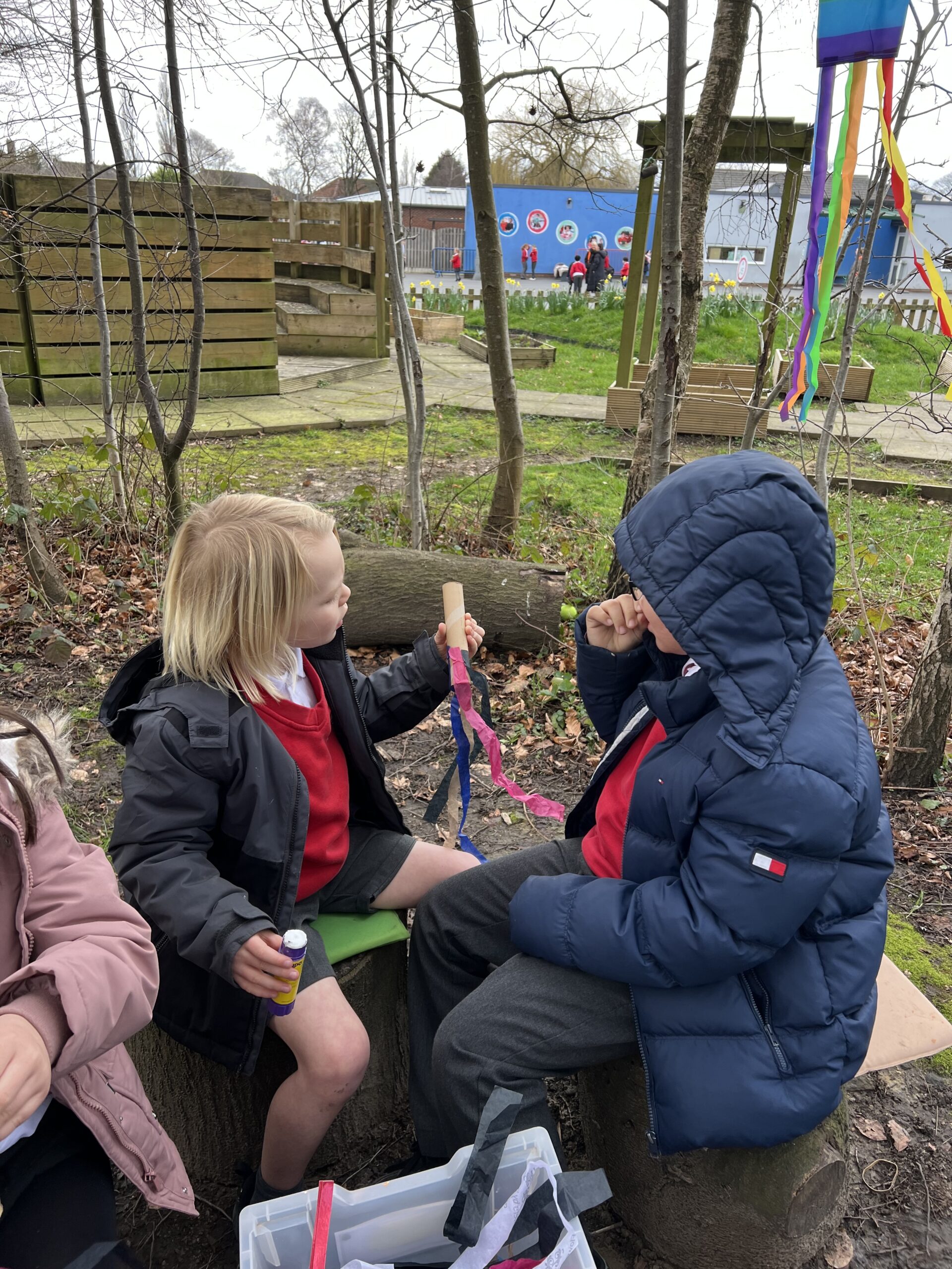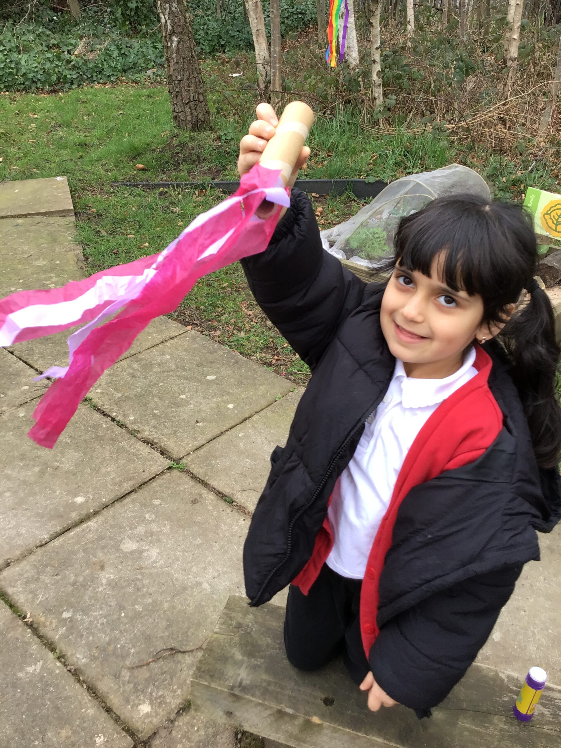 We made our own colourful wind socks from cardboard tubes and took them for. a run across the playground to see how the wind caught the streamers and made them move in the breeze.