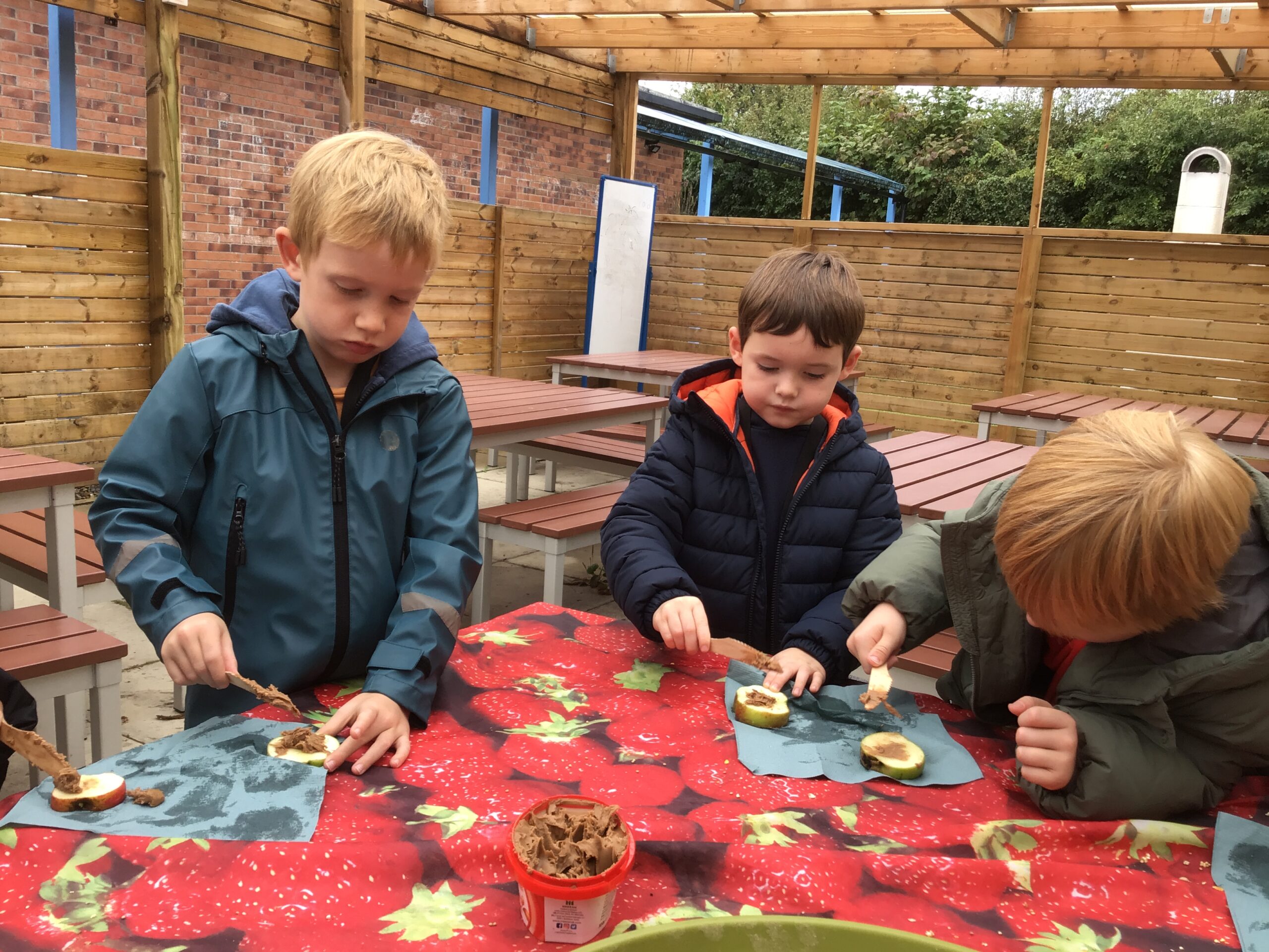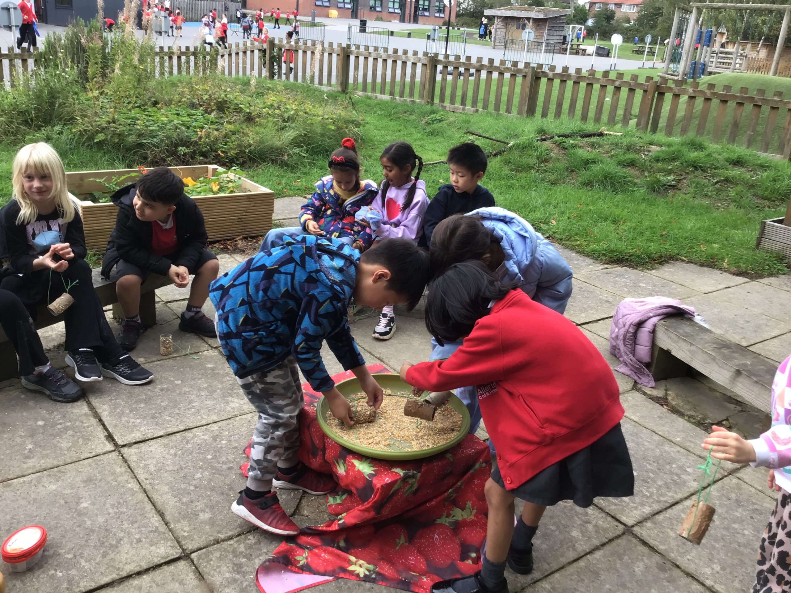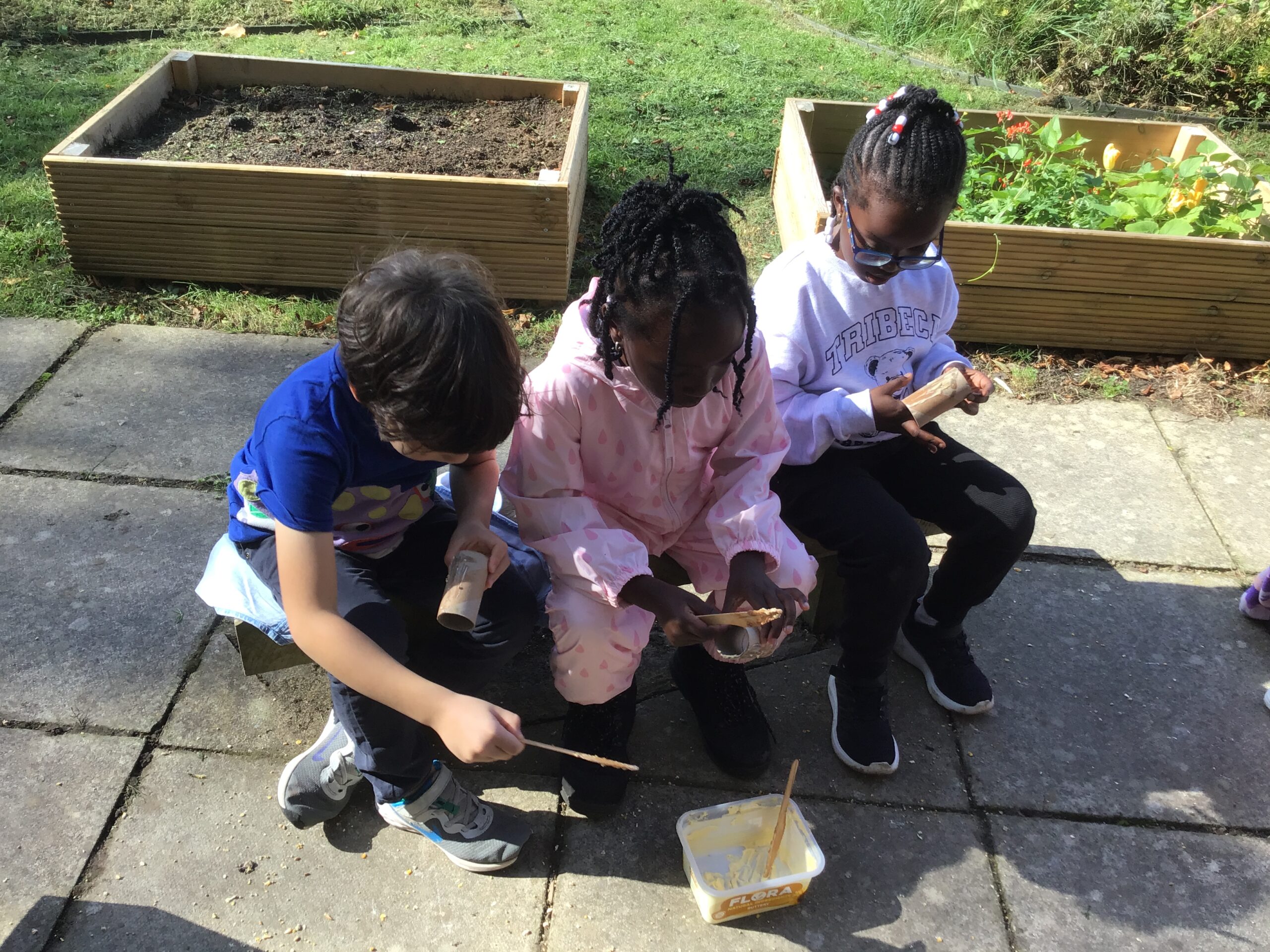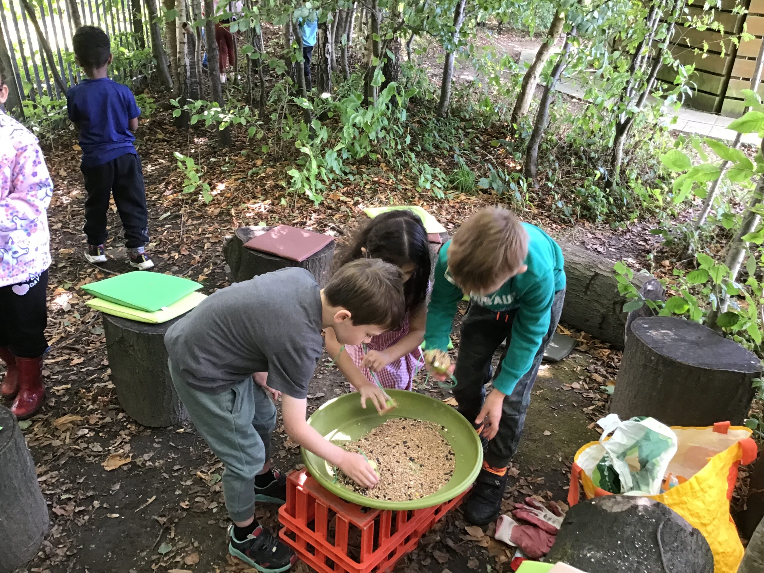 In September, each class enjoyed a Forest School team-building day with Mrs. Whittaker and their teachers. The common theme for all the activities was “Connecting with Nature.” We began our day by exploring the meaning of the word “Nature” before venturing outside to make bird feeders and to plant tomorrow’s oak trees and horse chestnut trees with acorns and conkers.